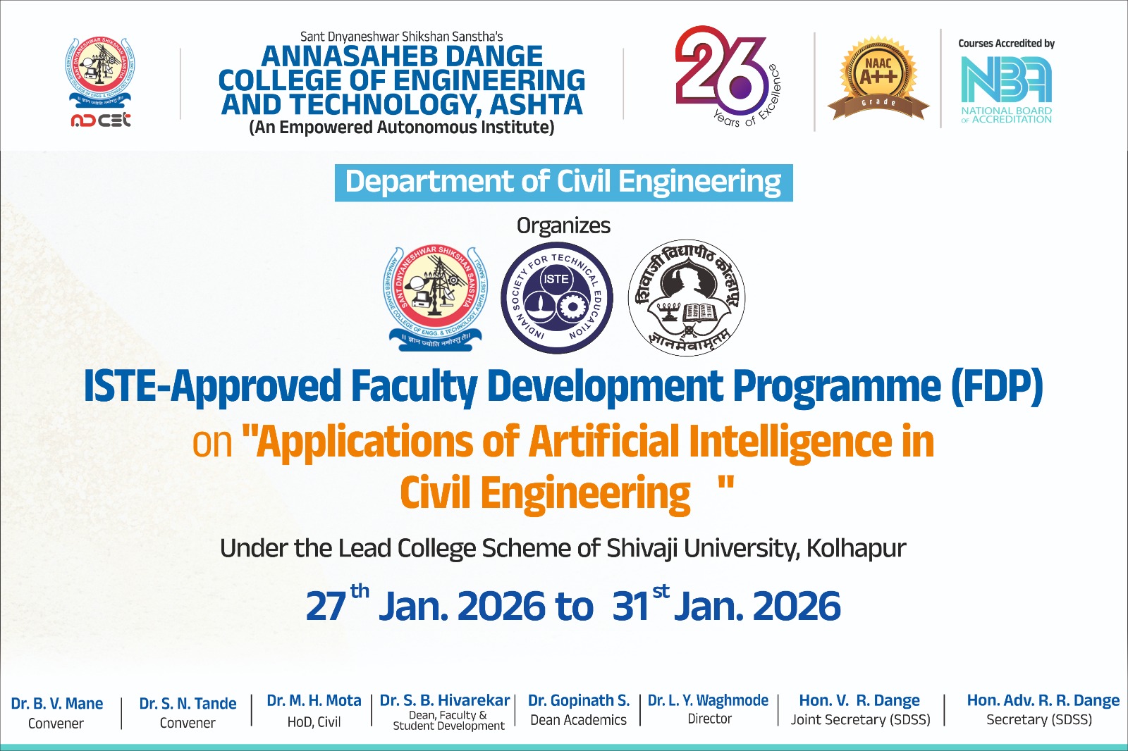 ISTE-Approved Faculty Development Programme (FDP) on “Applications of Artificial Intelligence in Civil Engineering” ???? Topic: “Applications of Artificial Intelligence and Machine Learning in Concrete Research” ???? Organized by: Dept. of Civil Engineering, ADCET, Ashta ???? Date: 27th Jan to 31st January 2026 ⏰ Time: 03:00 PM – 05:00 PM (IST)