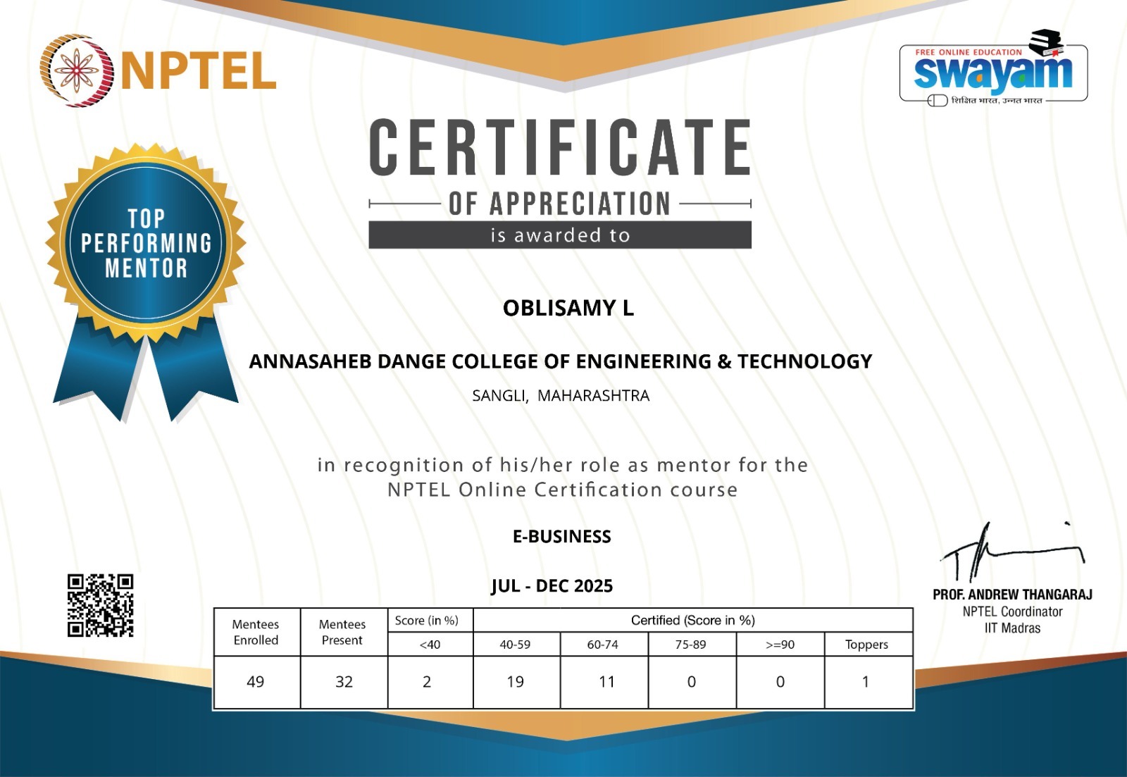 Mr. Oblisamy L has been honored with the “Top Performing Mentor” award by NPTEL – SWAYAM